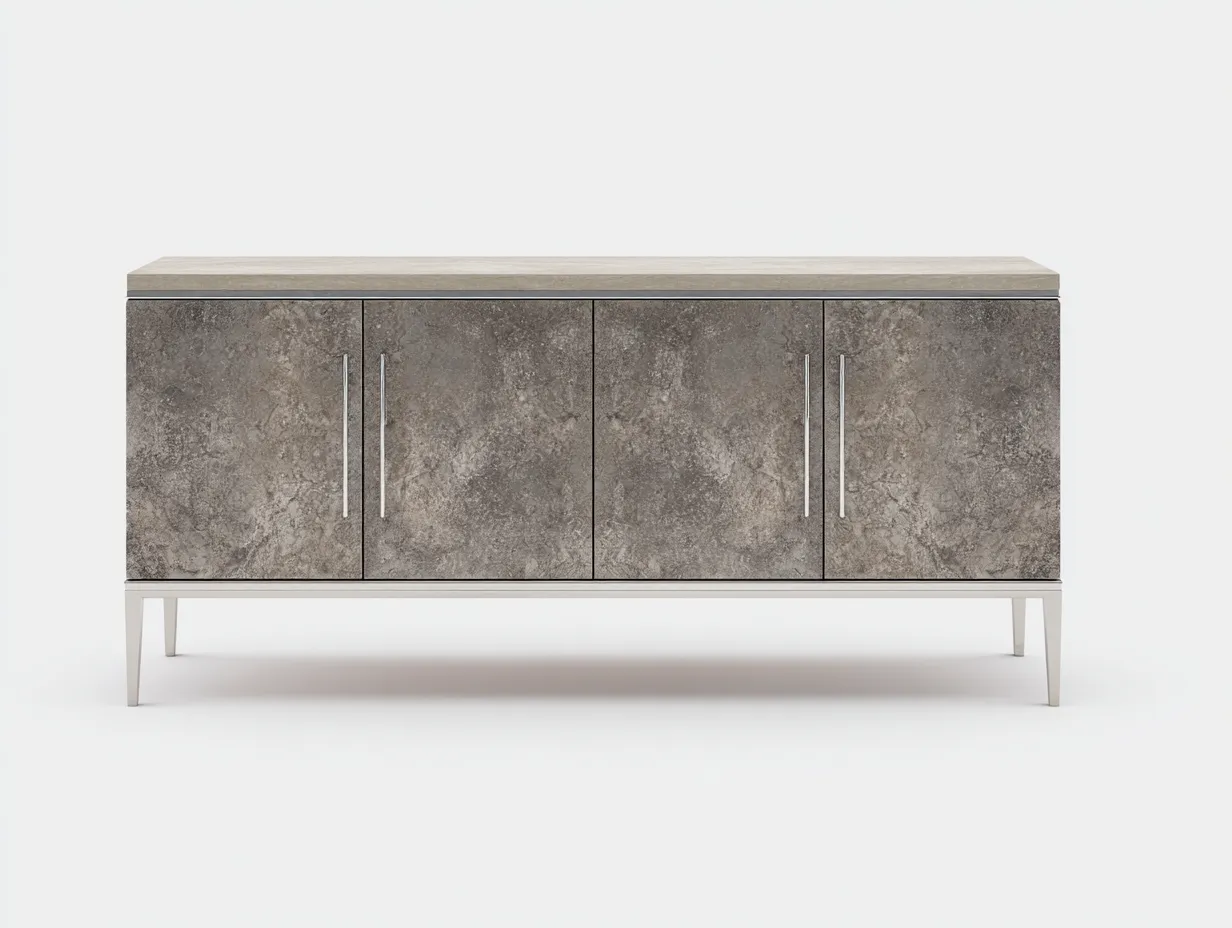 Fabricado en paneles resistentes con acabado efecto piedra gris, este aparador ofrece una estructura firme y visualmente sofisticada para el uso cotidiano. Las 4 puertas, la tapa superior en tono claro, los tiradores metálicos y las patas plateadas proporcionan una combinación adecuada de almacenaje, estabilidad y durabilidad dentro del salón.