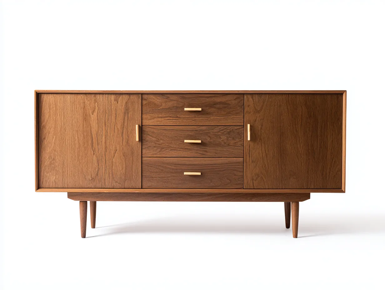 Este aparador de nogal combina calidez visual, proporciones limpias y una distribución muy práctica para mantener el salón ordenado con una estética cuidada. Su composición con dos puertas laterales y tres cajones centrales permite organizar vajilla, textiles, documentos o pequeños accesorios de forma clara y accesible, mientras que la veta natural de la madera aporta profundidad y un acabado acogedor. Los tiradores dorados discretos introducen un contraste elegante que realza el diseño sin recargarlo, y la base elevada sobre patas finas ayuda a aligerar visualmente el volumen del mueble.