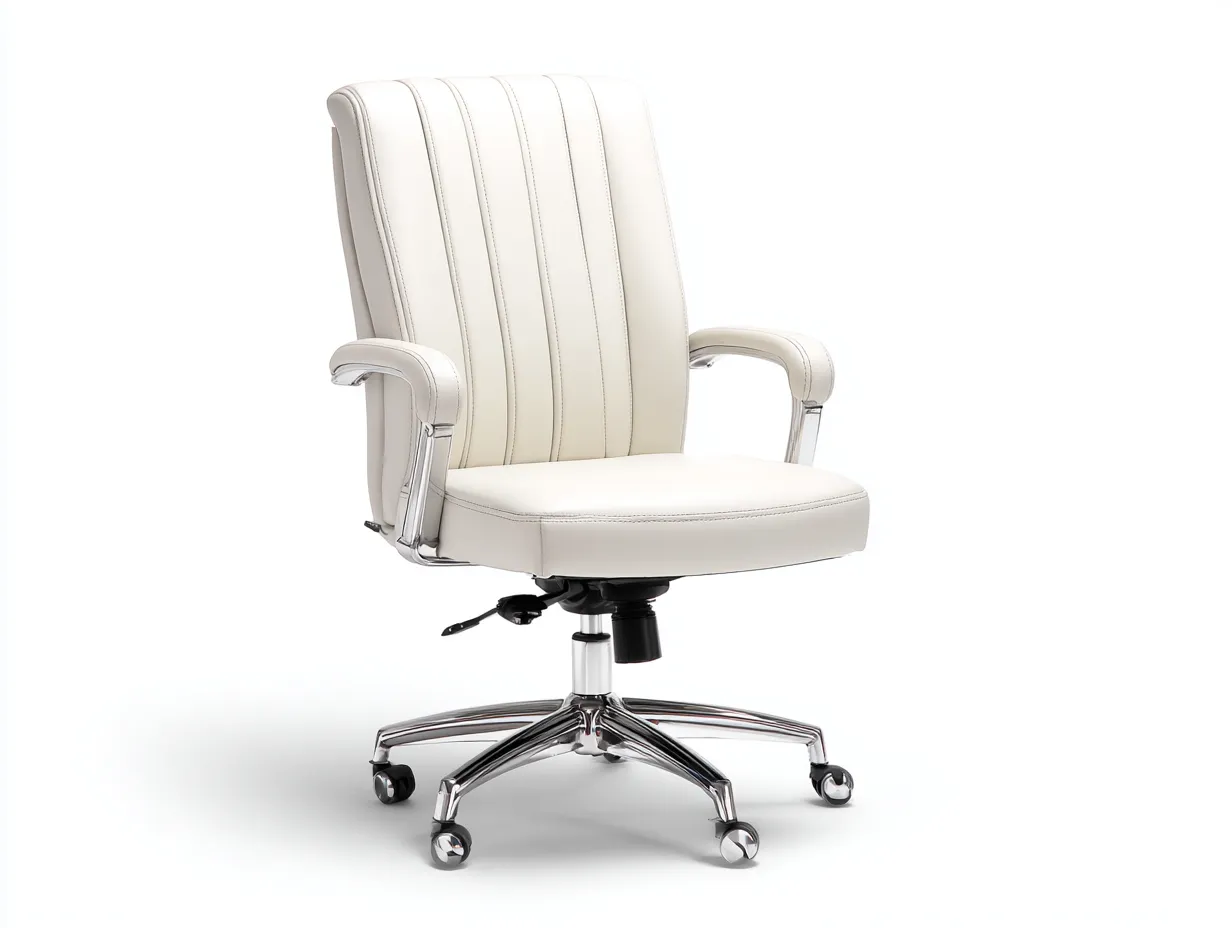 Esta silla de oficina en tono blanco crema combina elegancia y funcionalidad con un diseño de respaldo alto que mejora la postura durante el trabajo. Su estructura estilizada y detalles verticales aportan un aspecto refinado ideal para despachos profesionales o espacios modernos.