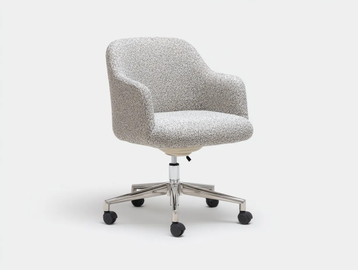 Esta silla de oficina en gris claro presenta un diseño compacto con líneas suaves y respaldo curvo que envuelve la espalda, proporcionando una sensación de confort en el uso diario. Su estilo discreto permite integrarla fácilmente en oficinas modernas o espacios domésticos.